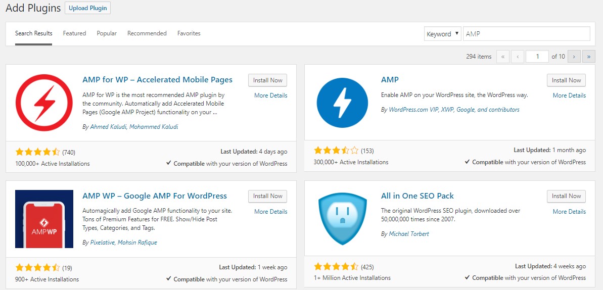 You can pick the plugin that is best for you. Since in our search, I am looking for AMP (Accelerated Mobile Pages) which happens to be the second plugin, I will click the ‘Install Now’ button.